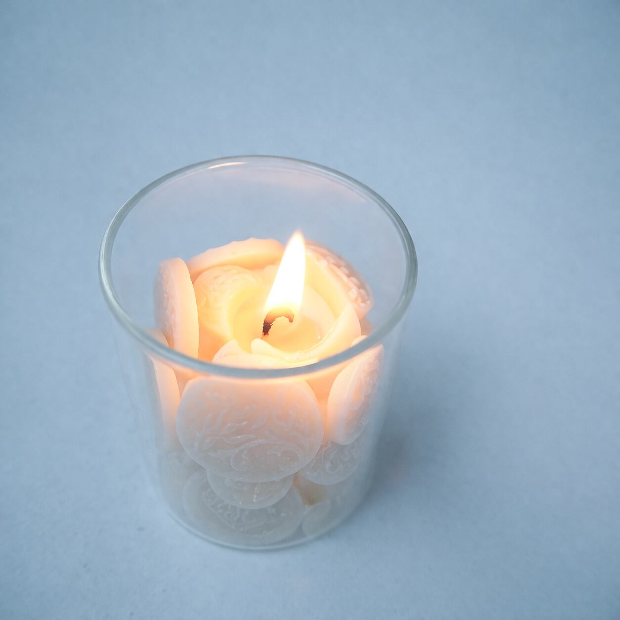 アンティークボタンの繊細な陰影を、国産の蜜蝋とソイワックスで再現し、小瓶の中に閉じ込めました。