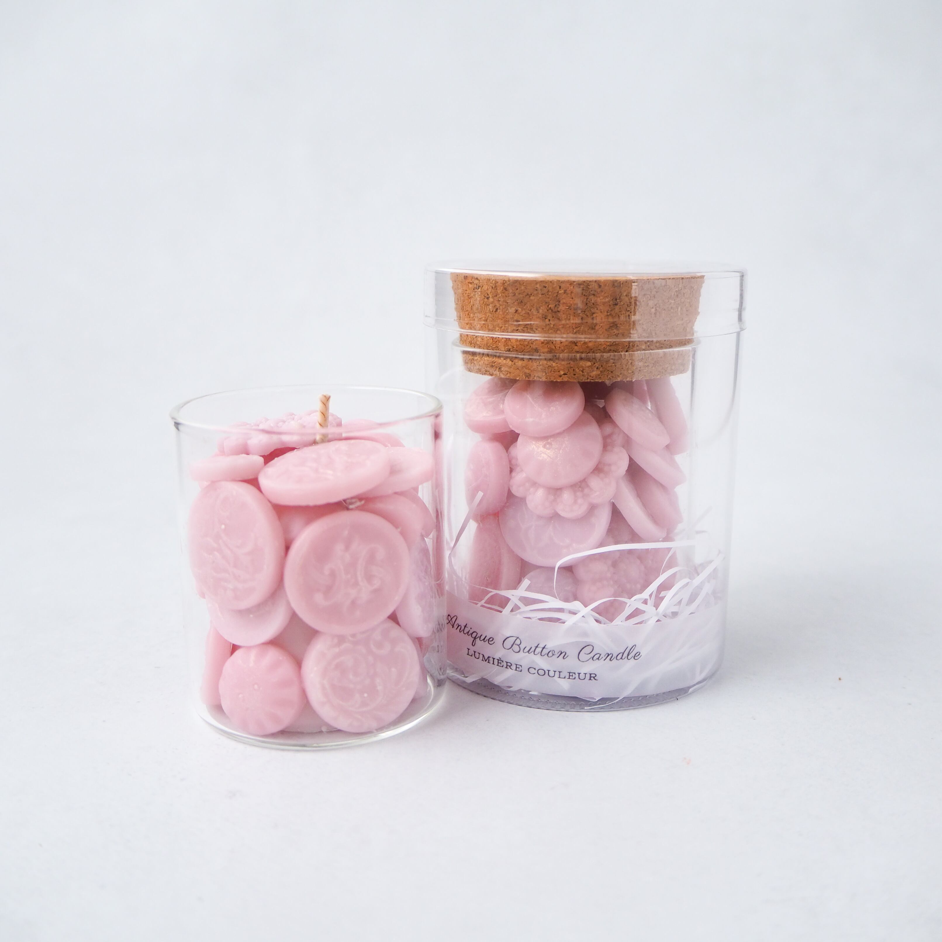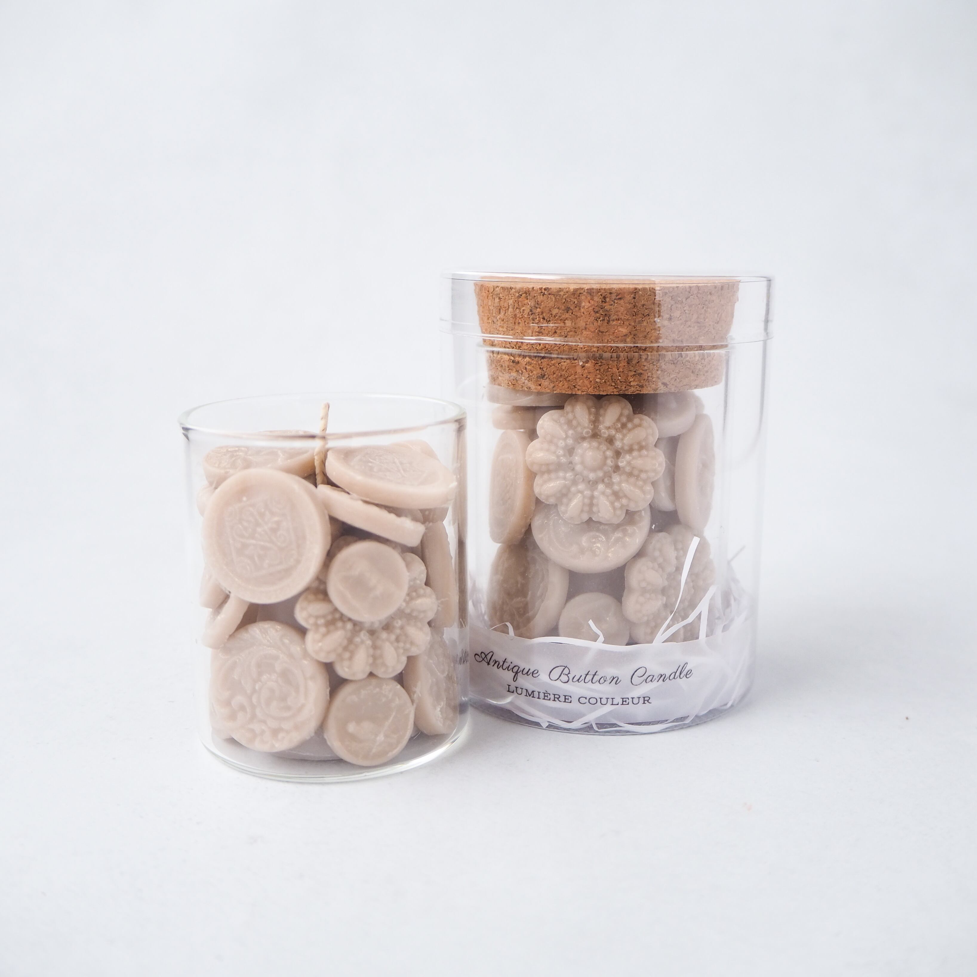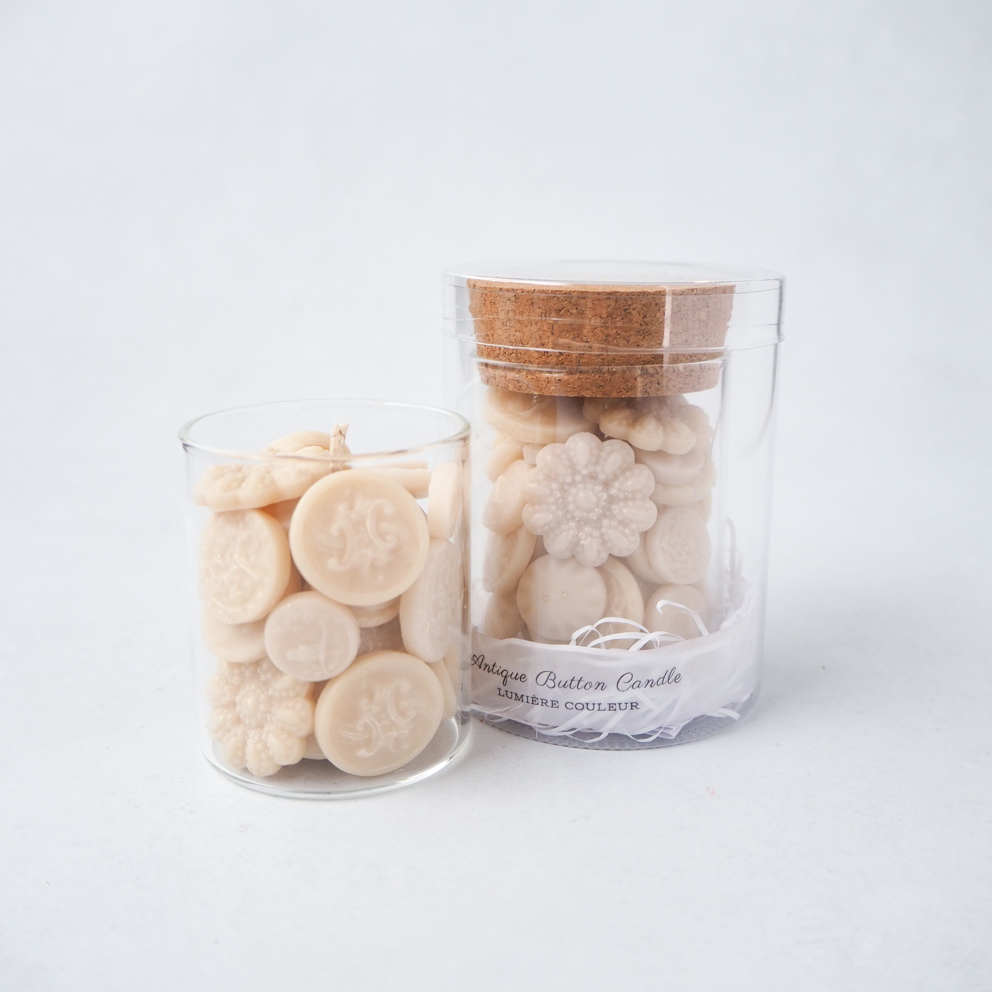 アンティークボタンの繊細な陰影を、国産の蜜蝋とソイワックスで再現し、小瓶の中に閉じ込めました。