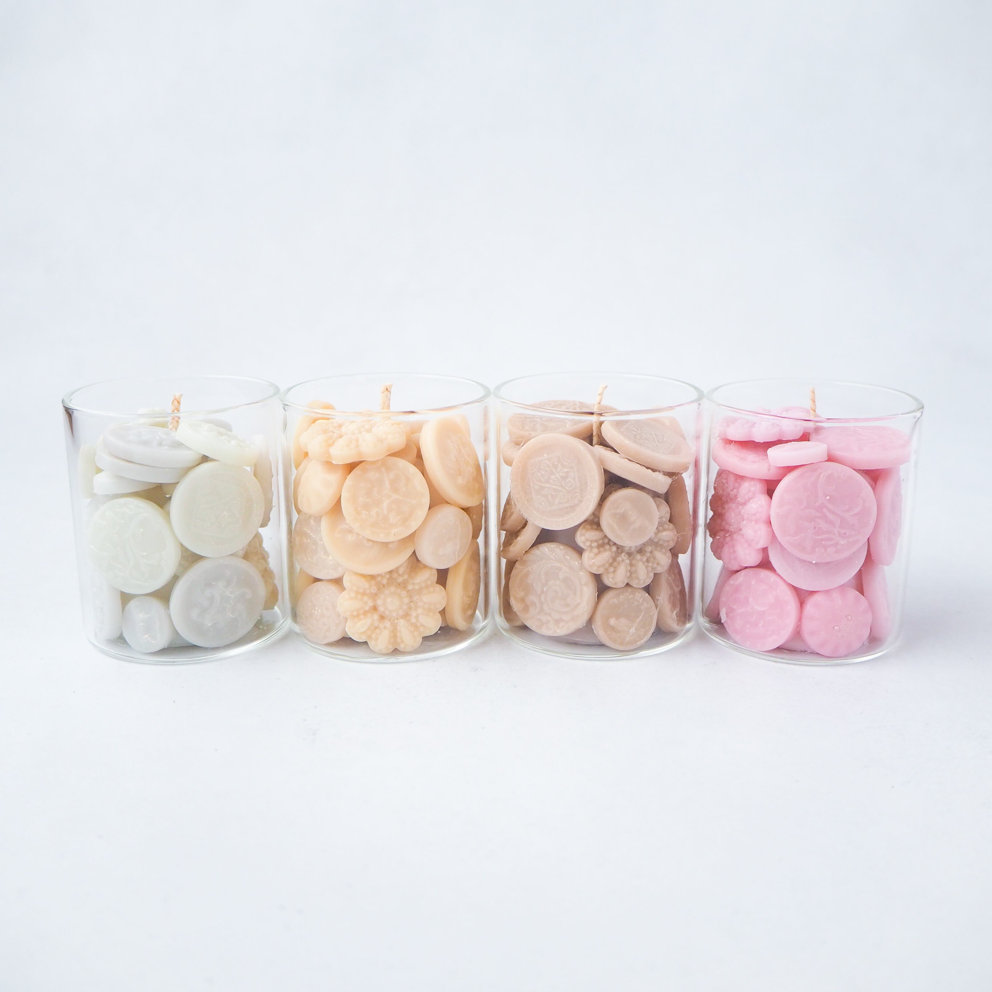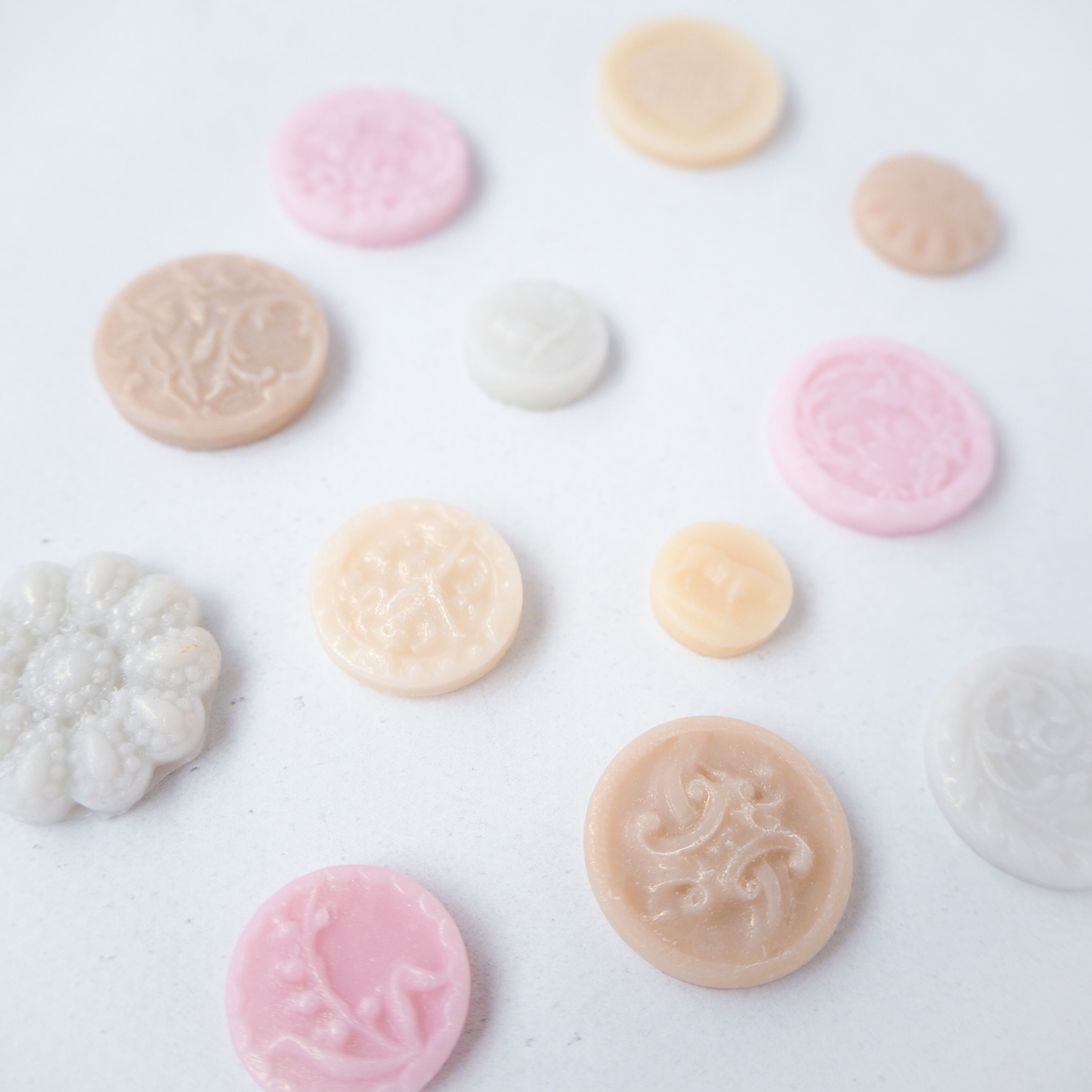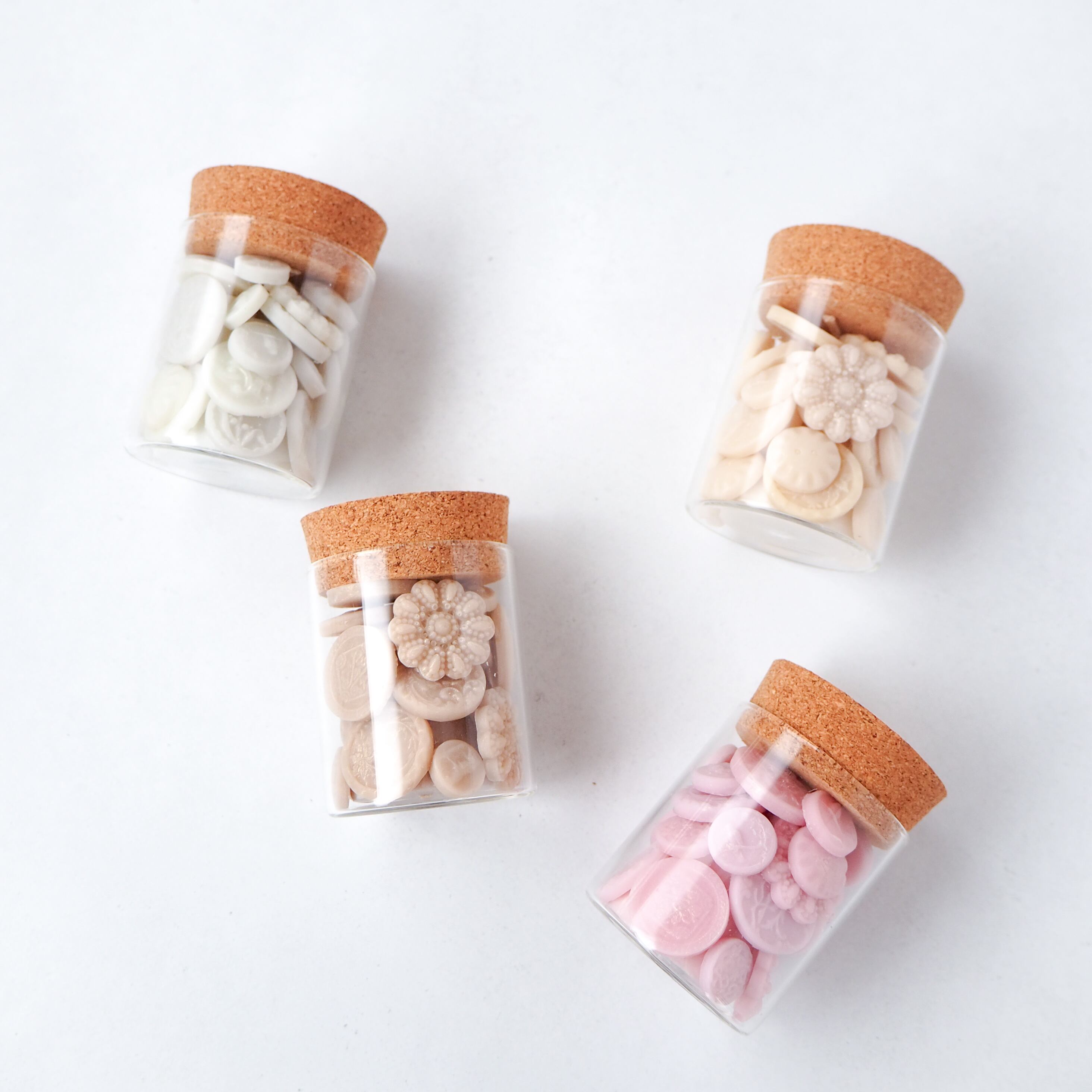 アンティークボタンの繊細な陰影を、国産の蜜蝋とソイワックスで再現し、小瓶の中に閉じ込めました。