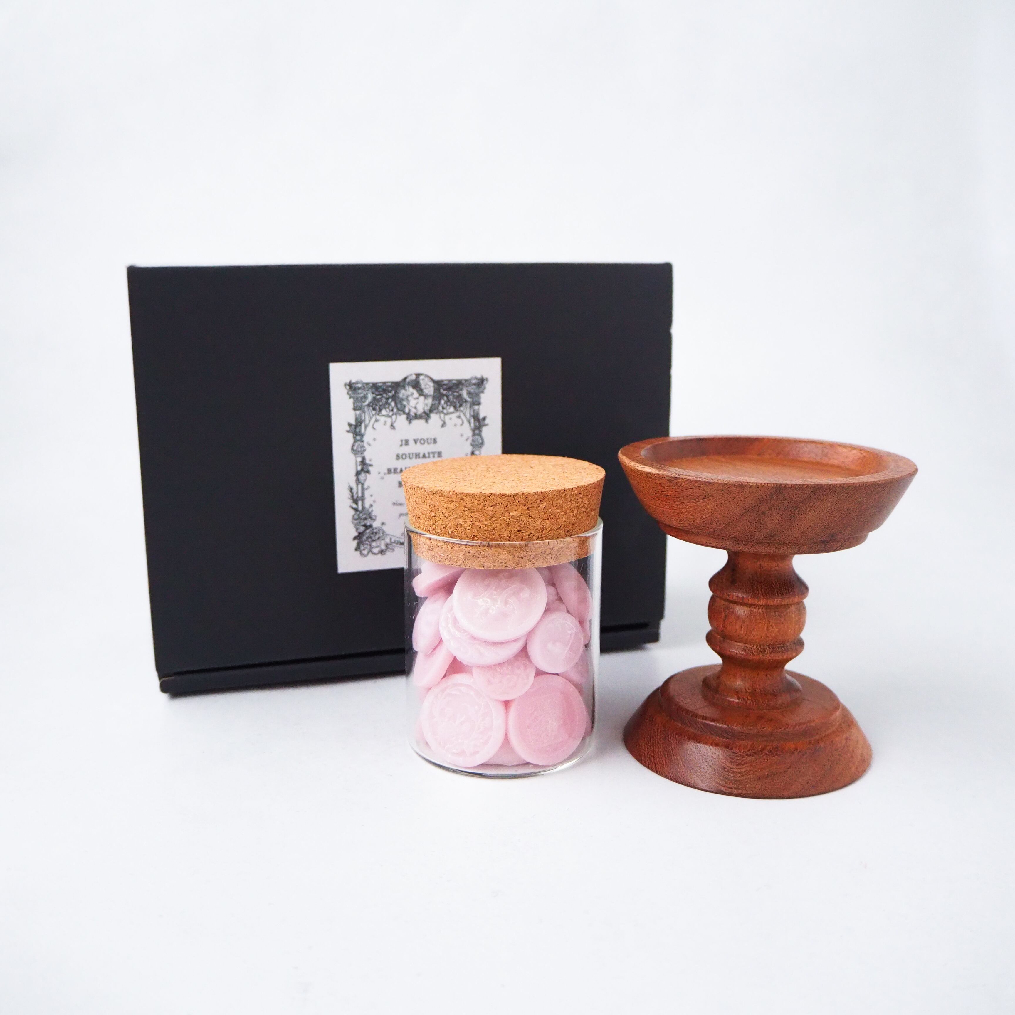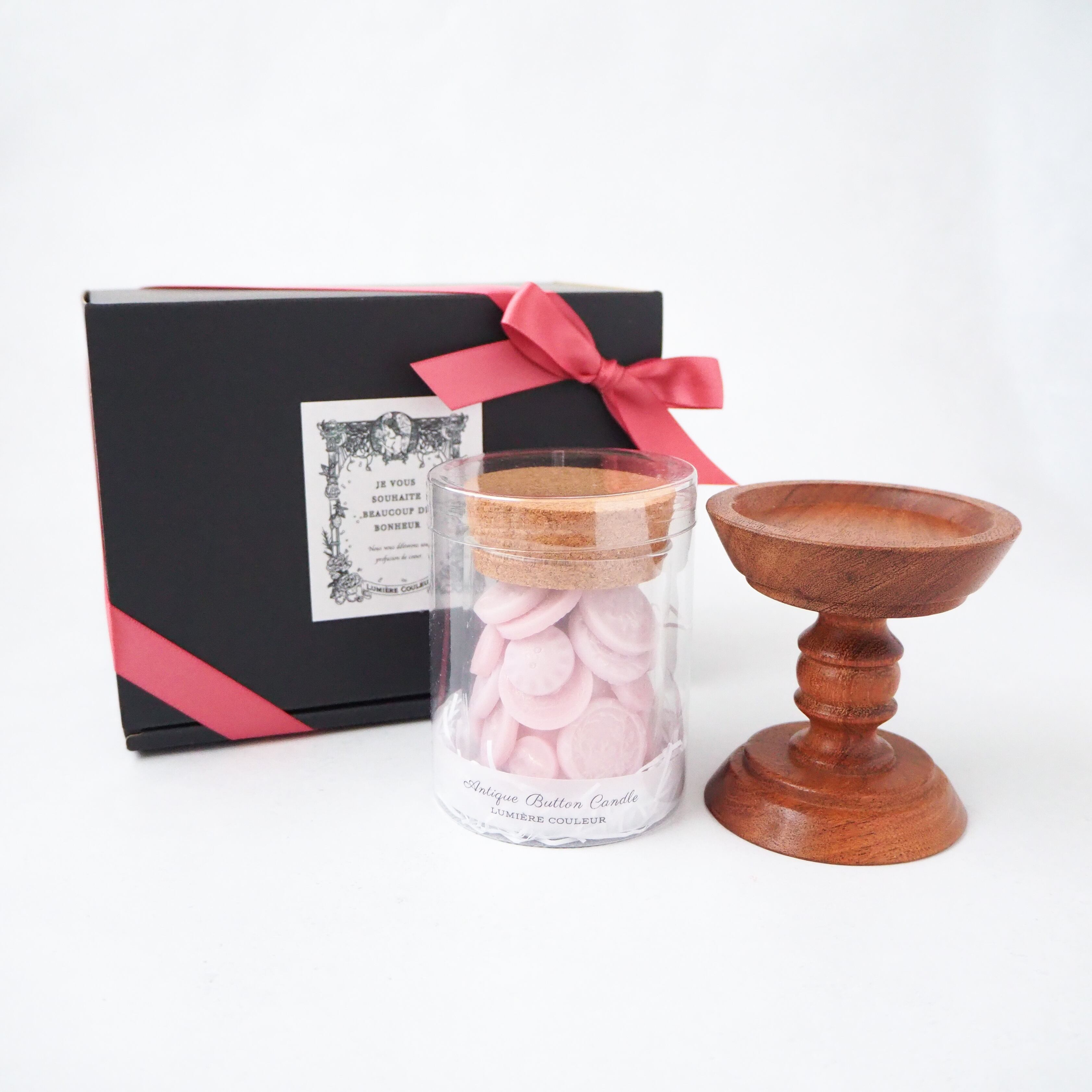 フランスのアンティークボタンをモチーフにしたキャンドルと、木の温もりを感じるキャンドルスタンドを組み合わせたセット。