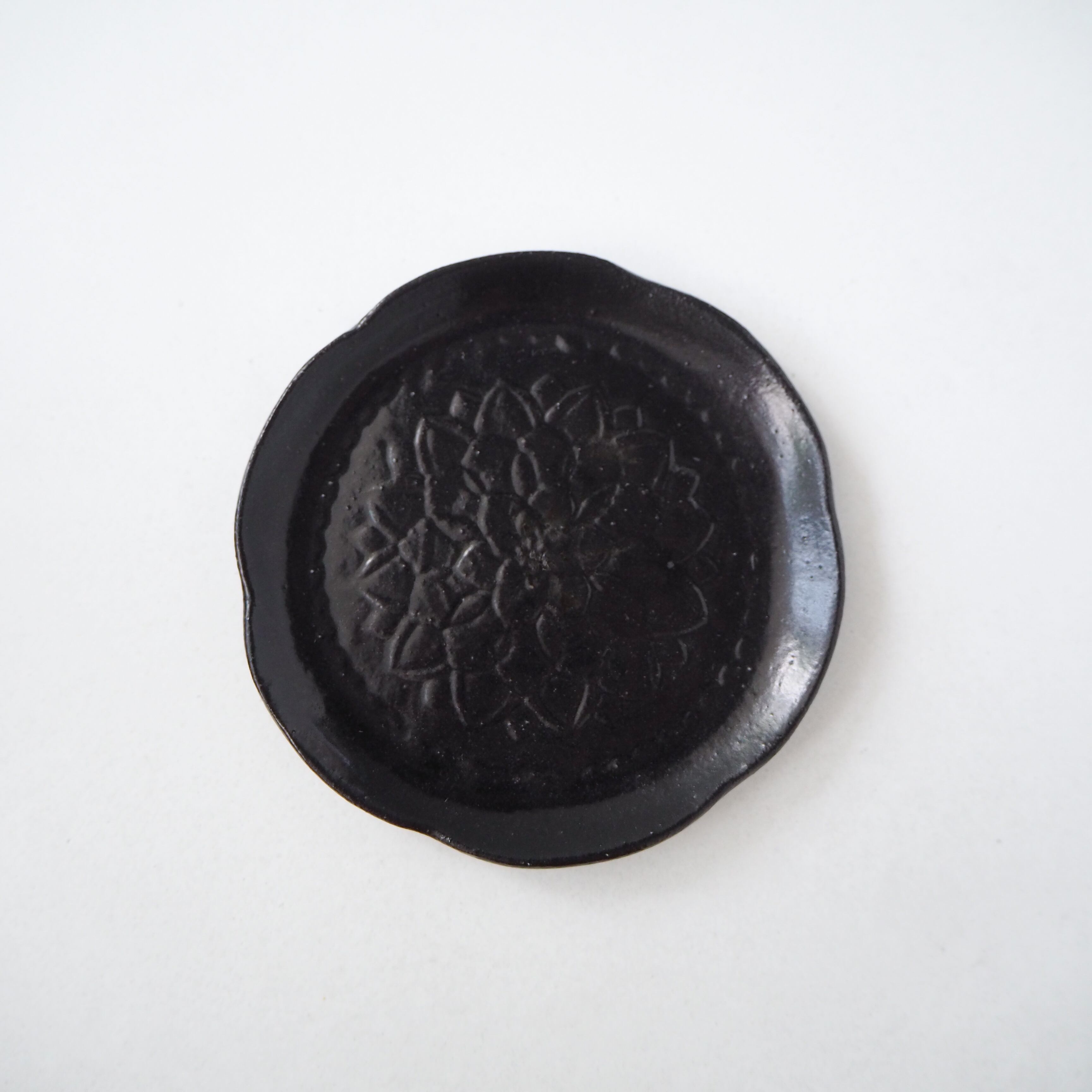 繊細な花模様を施した「刻花(こっか)」というデザインに、落ち着きある黒の釉薬を重ねた別注品。